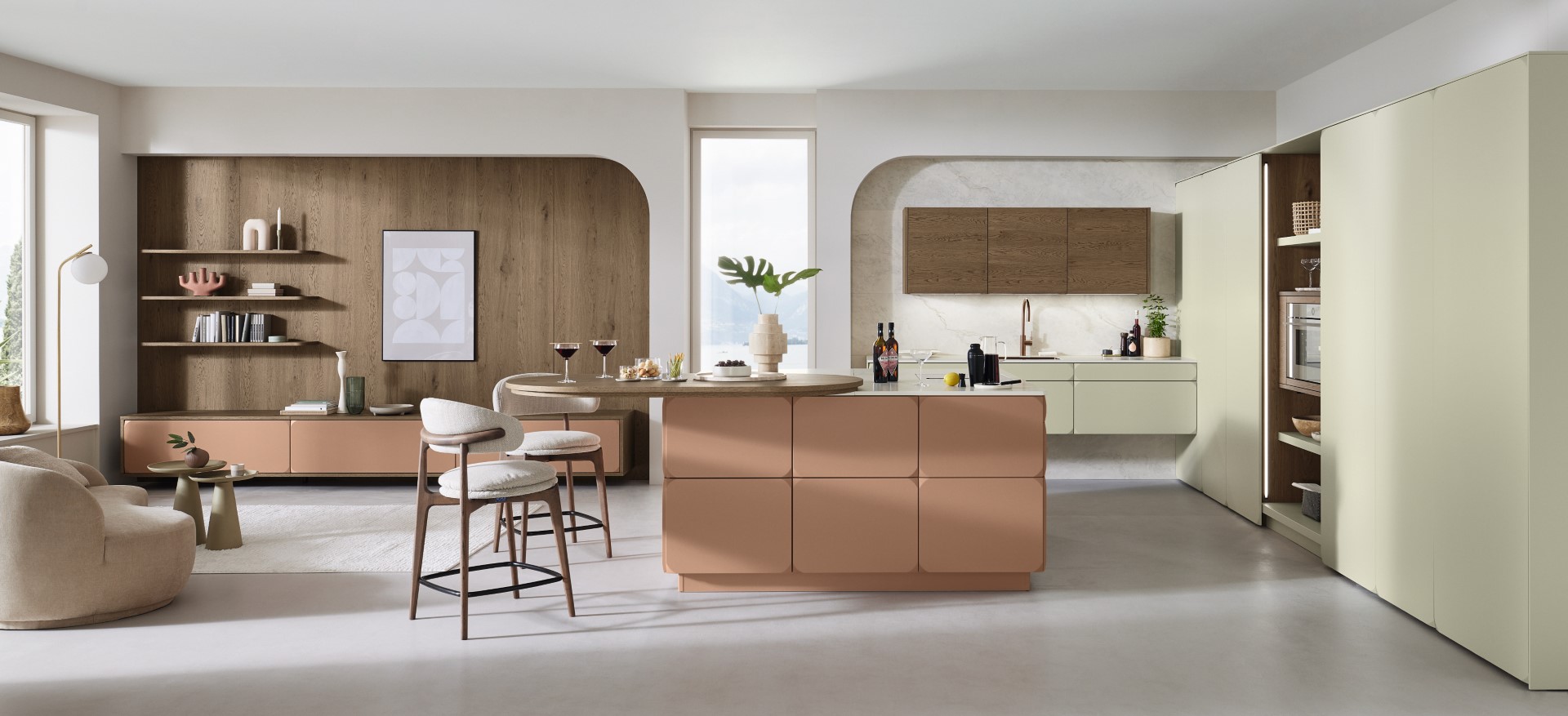 Fließende Übergänge zwischen Küche, Essen und Wohnen für ein harmonisches Gesamtbild.
